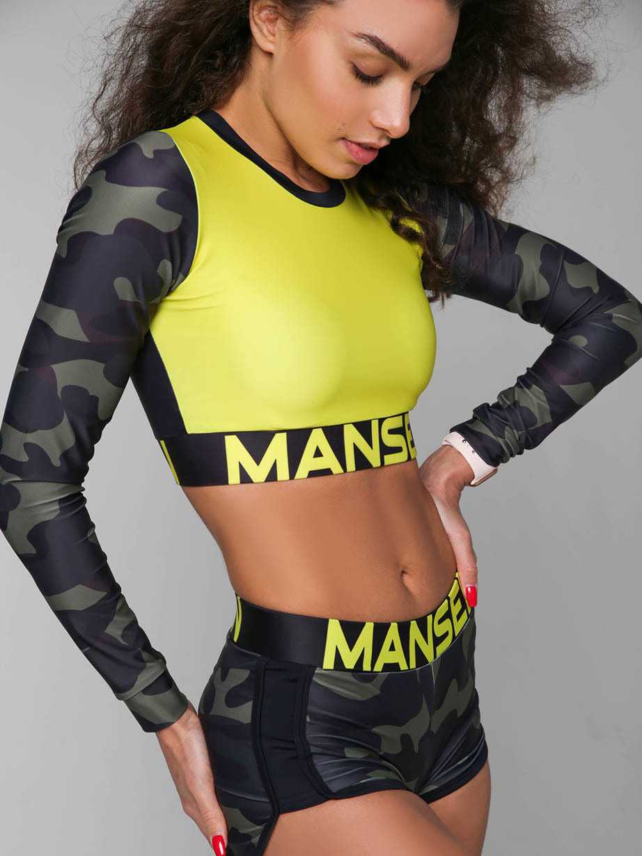 A short rash guard with long sleeves accentuates the waist and will perfectly match leggings or shorts. It is made of Italian matte biflex and has particularly elastic seams. The fabric removes excess moisture from the skin so that nothing distracts you from the workout. It is resistant to cracking and does not get affected by frequent washing.