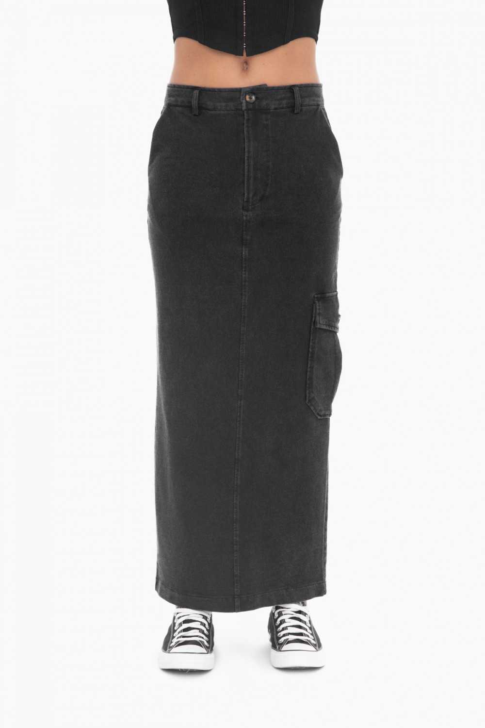Give off all the cool girl vibes in our cotton blend midi skirt. Made with a knit twill fabric with a mineral wash finish, this midi skirt features a back slit for easy movement, a cargo patch pocket, a fully functional front fly, belt loops, and hand pockets.